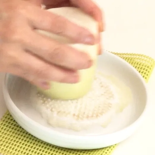 1. 葉っぱがついていた方を下にして、大根に両手を添え、優しく右回りにすりおろします。